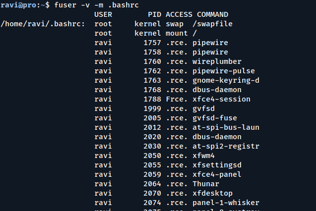 For a more detailed and clear output, enable the -v or --verbose as follows. In the output, fuser prints out the name of the current directory, then columns of the process owner (USER), process ID (PID), the access type (ACCESS), and command (COMMAND) as in the image below.