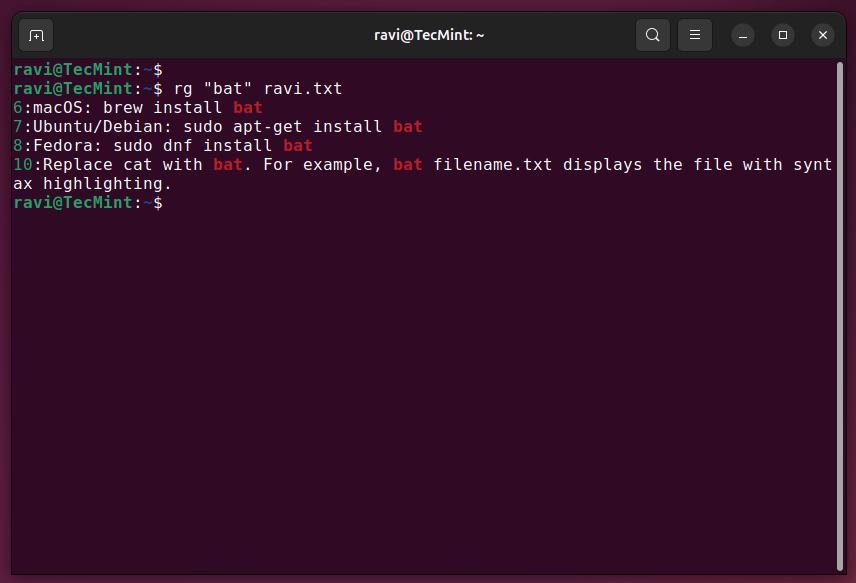 Once installed, just replace cat with bat. For example, bat filename.txt displays the file with syntax highlighting. If bat is not available, try batcat instead.