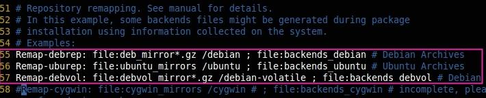 Remap-debrep: file:deb_mirror*.gz /debian ; file:backends_debian # Debian Archives Remap-uburep: file:ubuntu_mirrors /ubuntu ; file:backends_ubuntu # Ubuntu Archives Remap-debvol: file:debvol_mirror*.gz /debian-volatile ; file:backends_debvol # Debian Volatile Archives