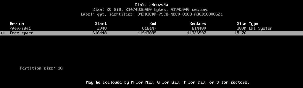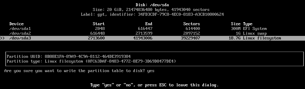 • EFI System partition (/dev/sda1) with 500M size, FAT32 formatted.