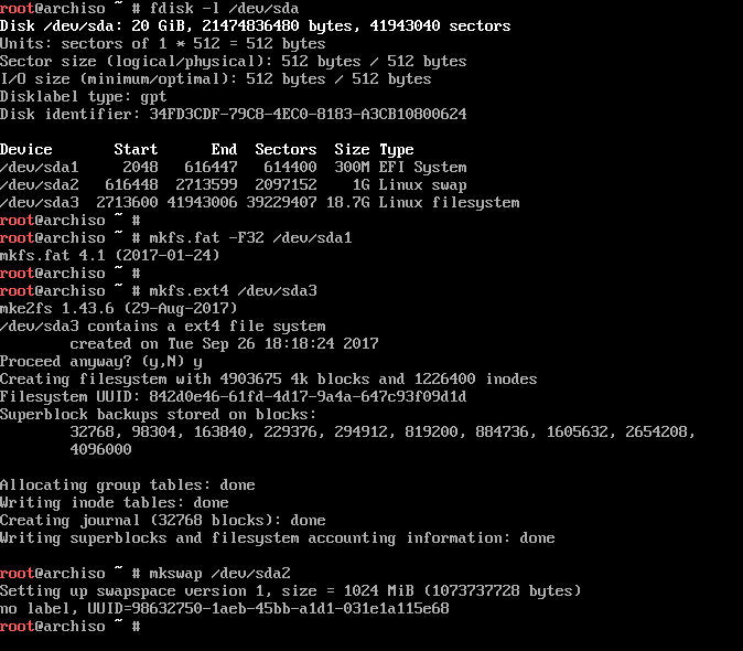 10. Now, it’s time to format the partitions with the required file systems. Issue the following commands to create a FAT32 file system for the EFI System partition (/dev/sda), to create the EXT4 file system for the root partition (/dev/sda3), and create the swap partition for /dev/sda2.