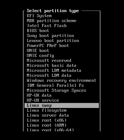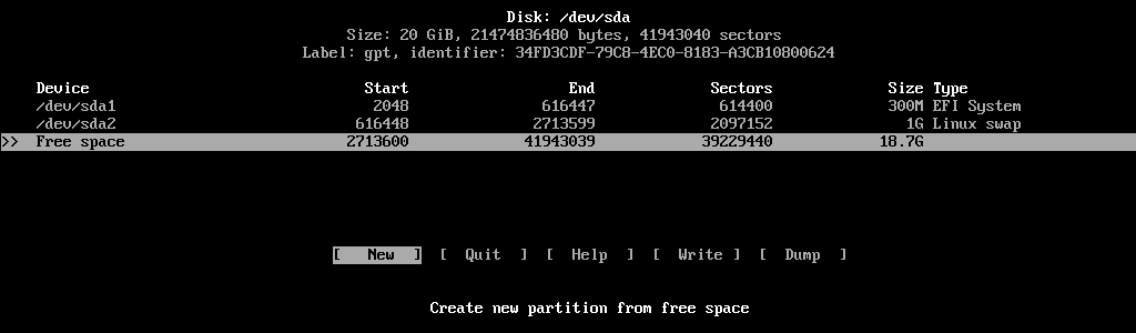 7. Next, let’s create the Swap partition using the same procedure. Use the down arrow key and select again the remaining Free Space.