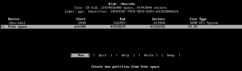 Once you run the command, you will be prompted to select the label type. select GPT, then Free Space and hit on New from the bottom menu, as illustrated.