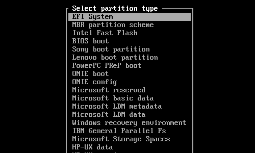 6. Type the partition size in MB (500M) and press enter key, select Type from the bottom menu, and choose EFI System partition type, as shown in the following screenshots.