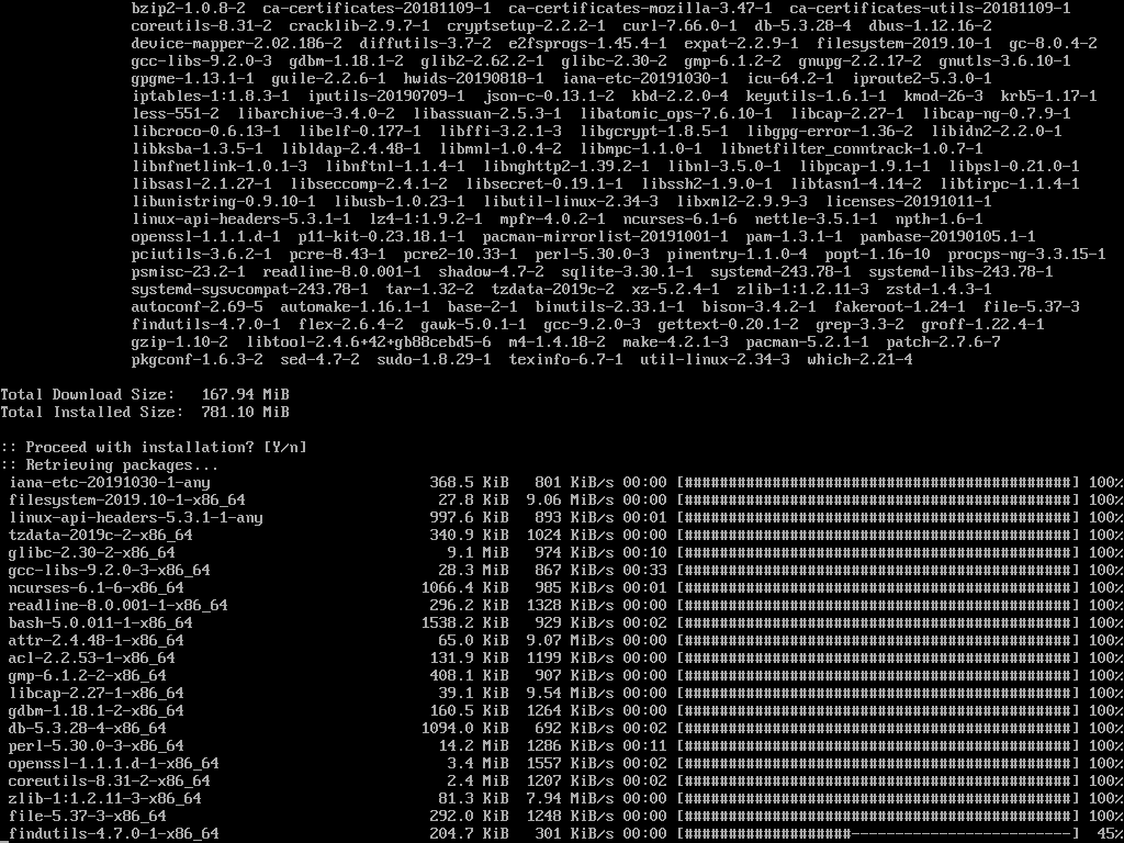 # pacstrap /mnt base base-devel linux linux-firmware nano (“linux linux-firmware nano” is in your tutorial missing)