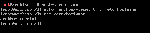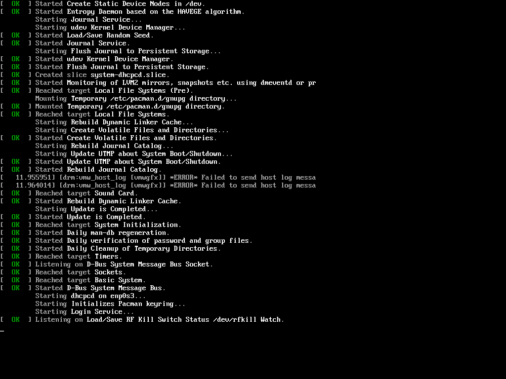 4. After the installer decompresses and loads the Linux Kernel you will be automatically thrown to an Arch Linux Bash terminal (TTY) with root privileges.