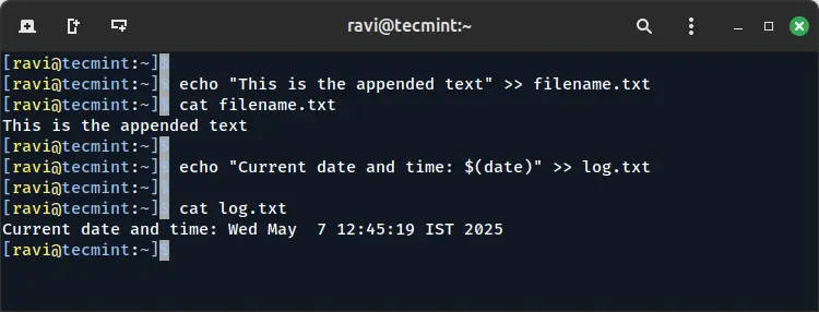 echo "This is the appended text": This command outputs the text you want to append.>> filename.txt: The>>operator appends the output of theechocommand to the specified file, in this case,filename.txt.