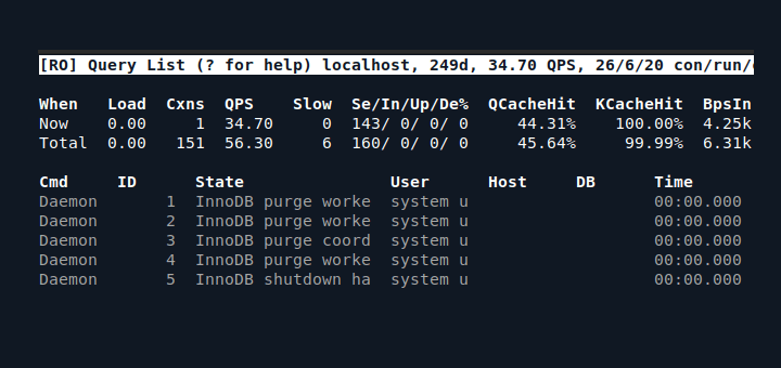Innotop is an excellent command-line program, similar to the top command, designed to monitor local and remote MySQL servers running