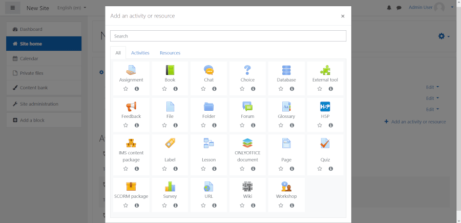 After the Edit mode is enabled, click the Add an activity or resource option and find Assignment. Click the icon to proceed.