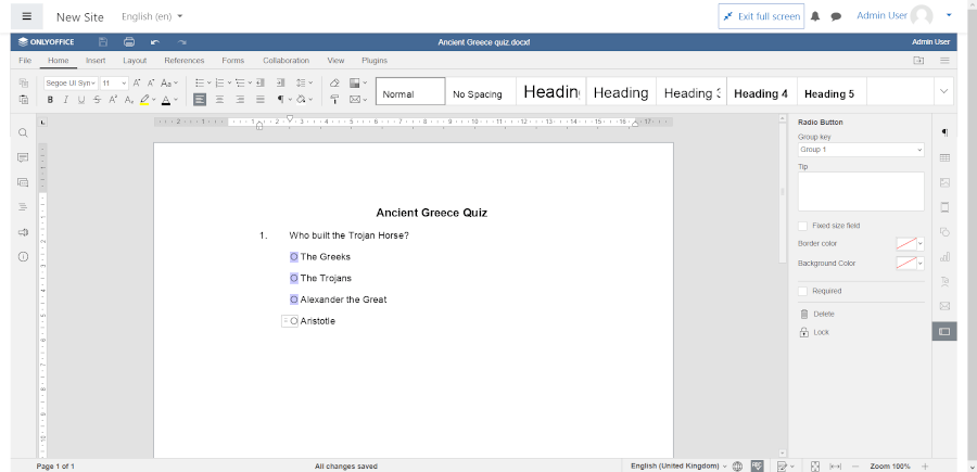 The ONLYOFFICE Docs integration within Moodle allows educators to create engaging courses by adding fillable forms as individual or group assignments.