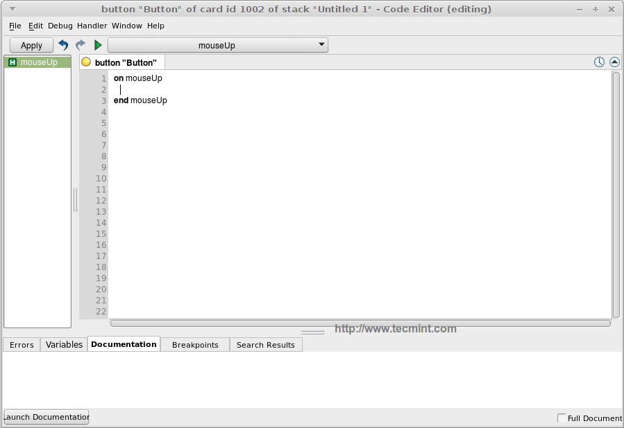 - Write Your Script – In the Code Editor, you’ll see a default on the mouseUp event handler. Modify it to display a message when clicked.