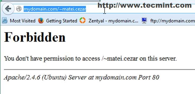 As you can see Apache has no permissions for accessing per user directory or index user’s home. To correct this behaviour we must provide www-data with execution permissions on /home/$USER directory and create a public_html folder under users path.