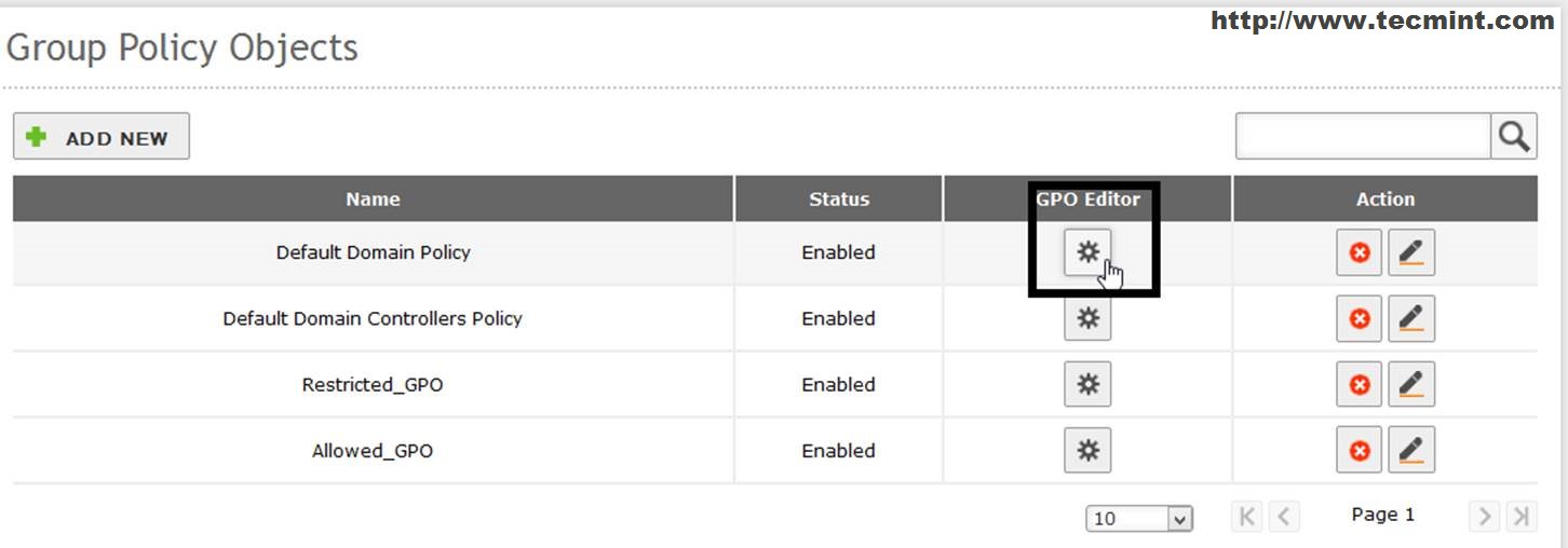 9. Open Zentyal Web Administration Tool (https://zentyal_IP) and go to Domain -> Group Policy Objects -> Default Domain Policy -> GPO Editor.