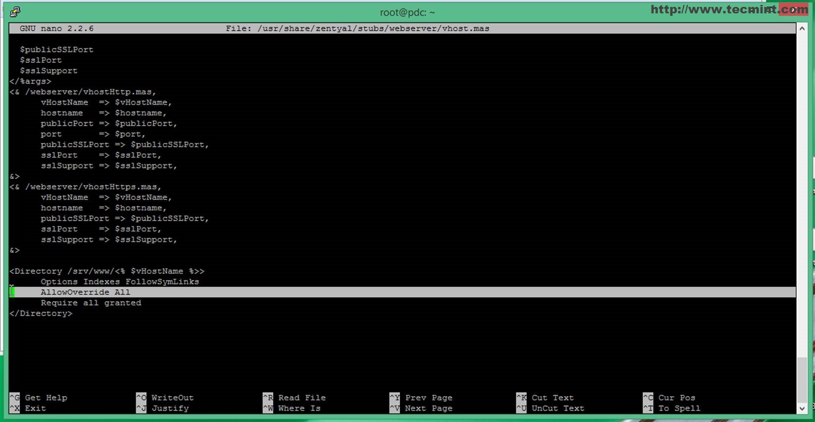 13. After the module is loaded is time to modify Zentyal Apache Vhost template located in “/usr/share/zentyal/stubs/webserver/” path and setup “AllowOverride“.