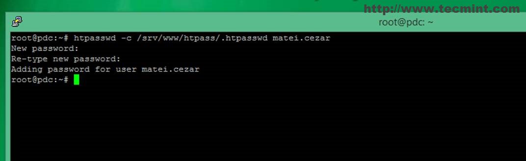 16. Now it’s time to create .htpasswd file and add some users using htpasswd command. When first user is created add “–c” (create) command switch to create the file and add user then enter and confirm user password.