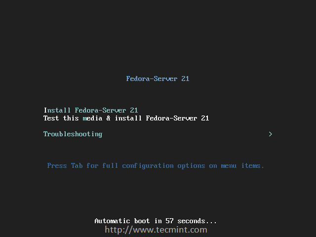 2. After making bootable CD/DVD or USB drive, restart your computer in order to boot from the chosen drive and select “Install Fedora-Server 21” to continue.