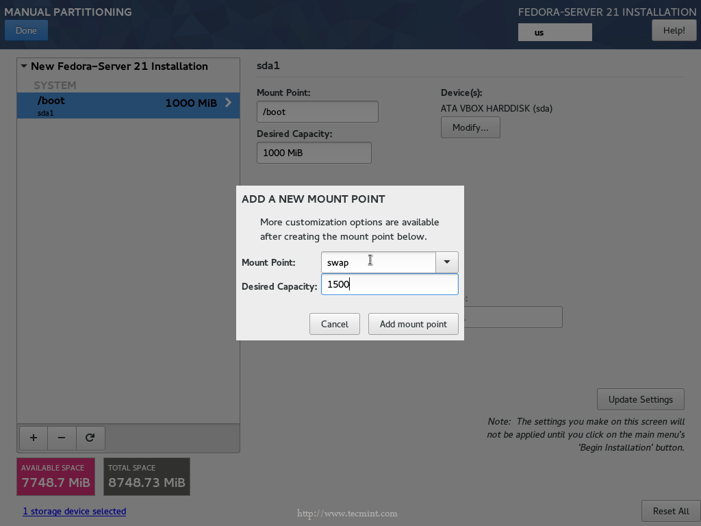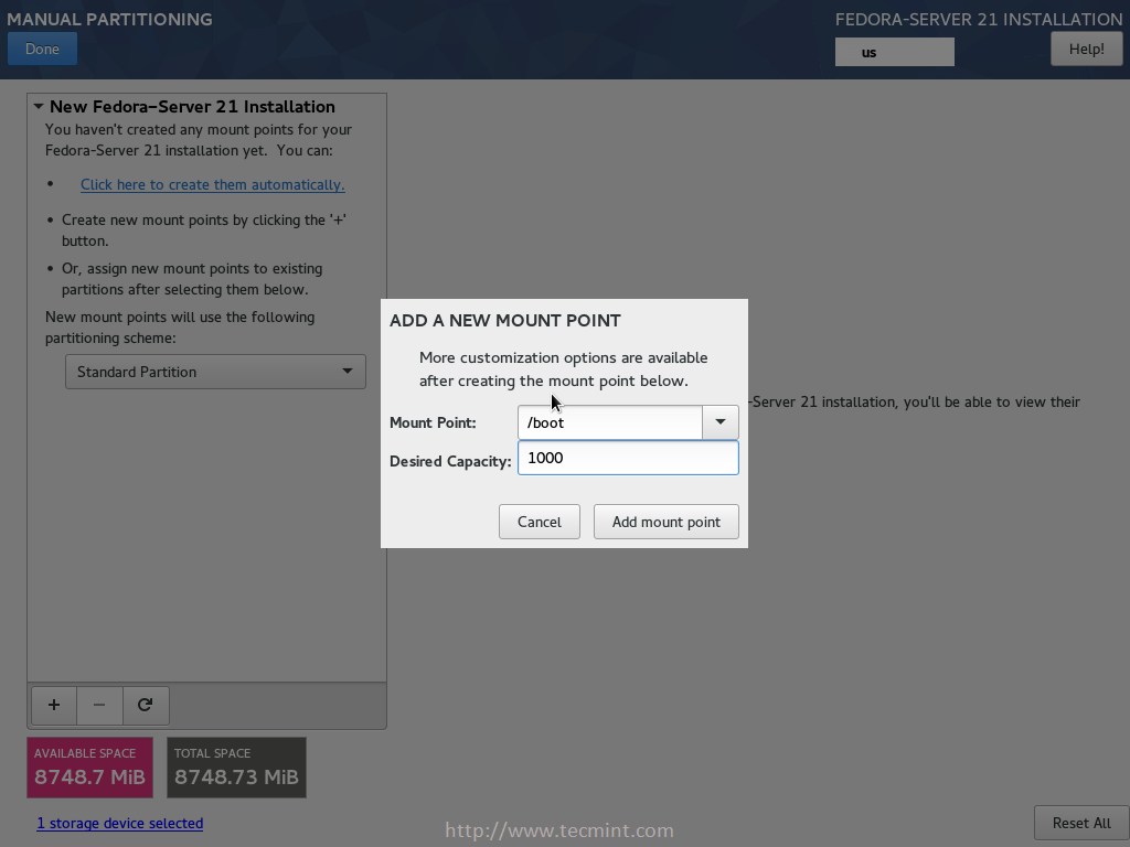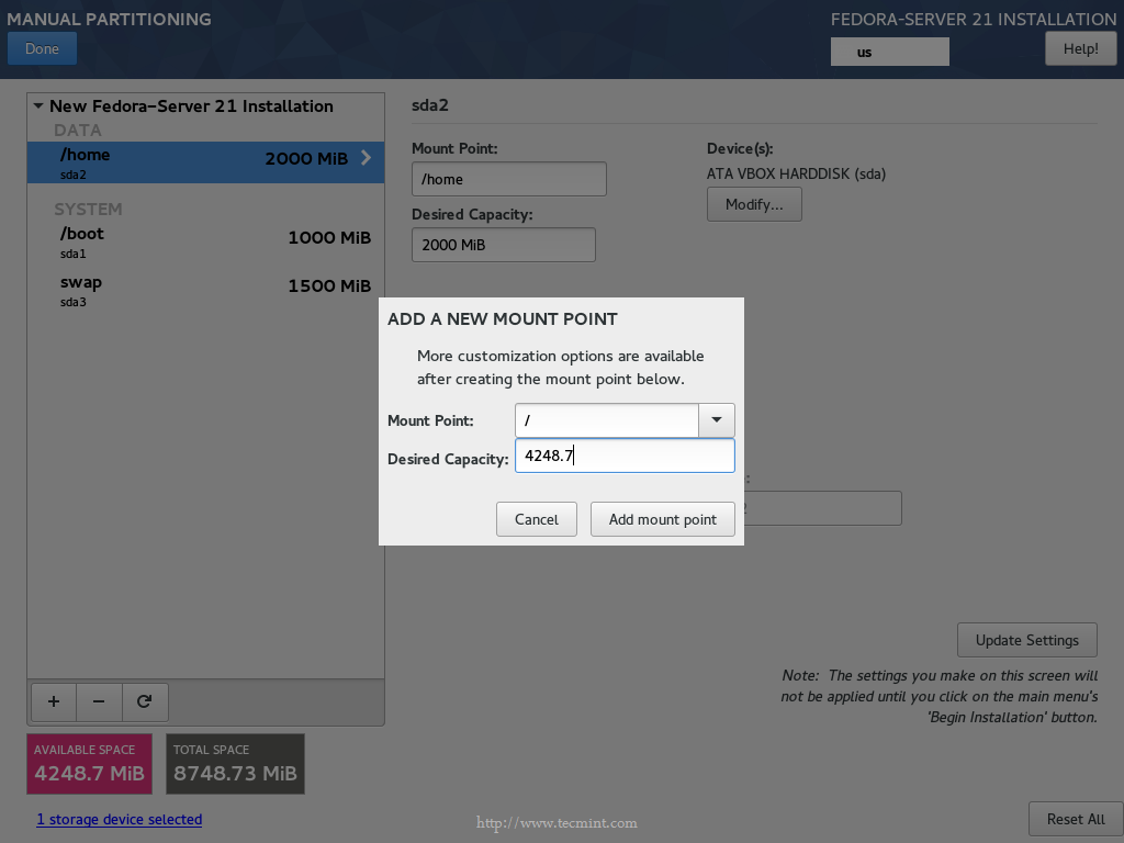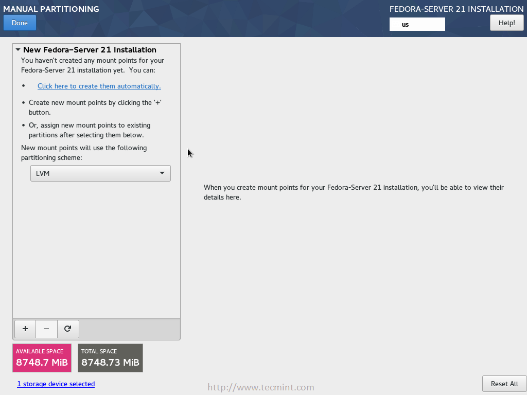 In this area, you’ll have to configure the hard drive that you want to install Fedora Server 21 on it.. Choose the hard drive first from the “Local Standard Disks” frame, then under “Other Storage Options” flag the “I will configure partitioning” check box and click on “Done”.