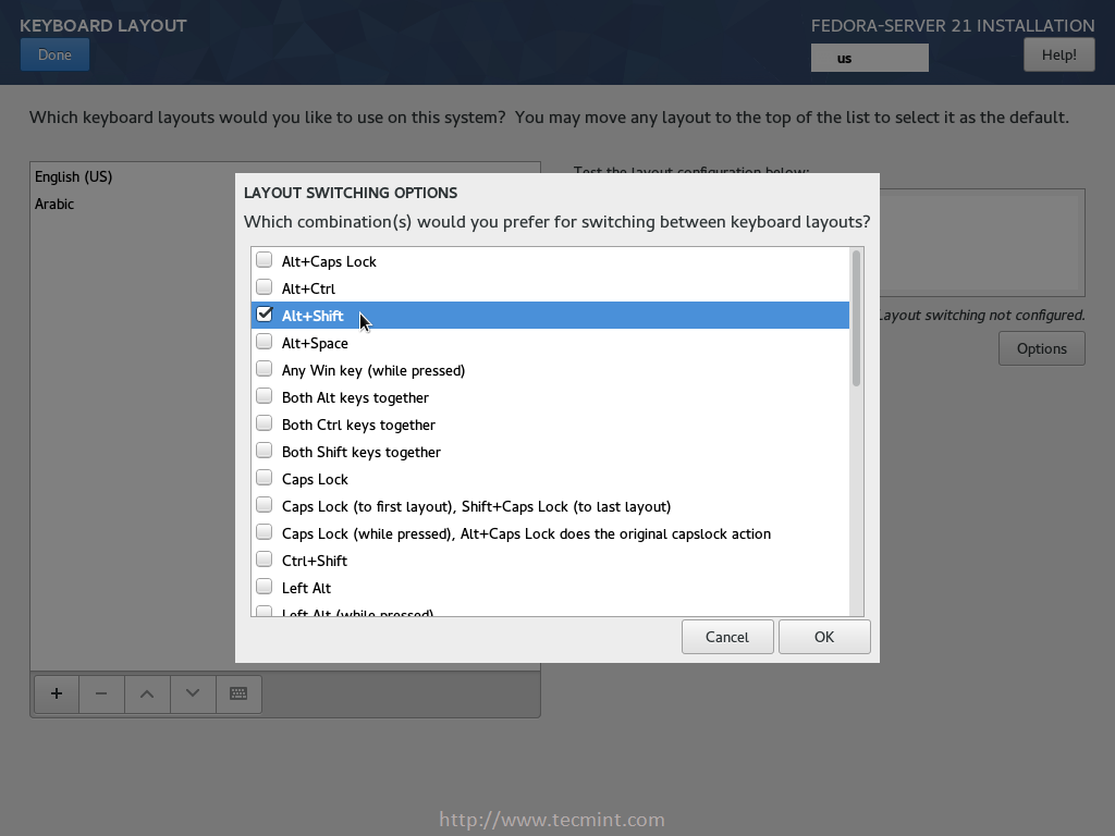 9. In order to enable switching between layouts, click on the “Options” button on the right and choose “Alt + Shift”.