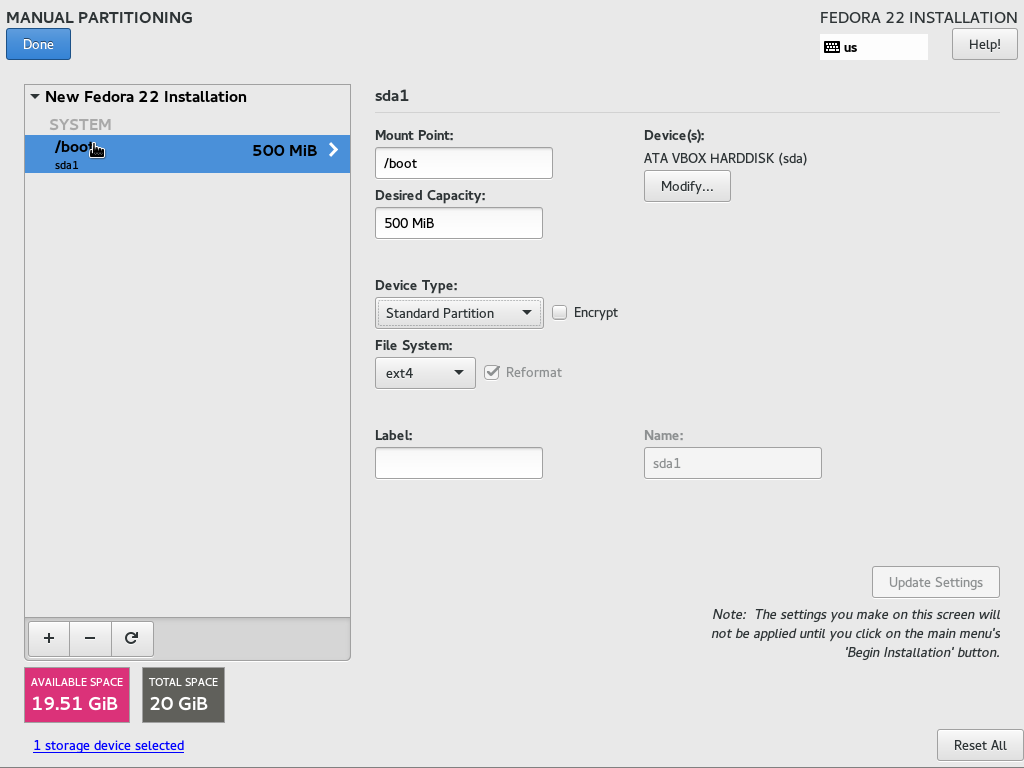 Note that File System type for /boot must be ‘ext4‘ and device type is ‘Standard Partition‘.