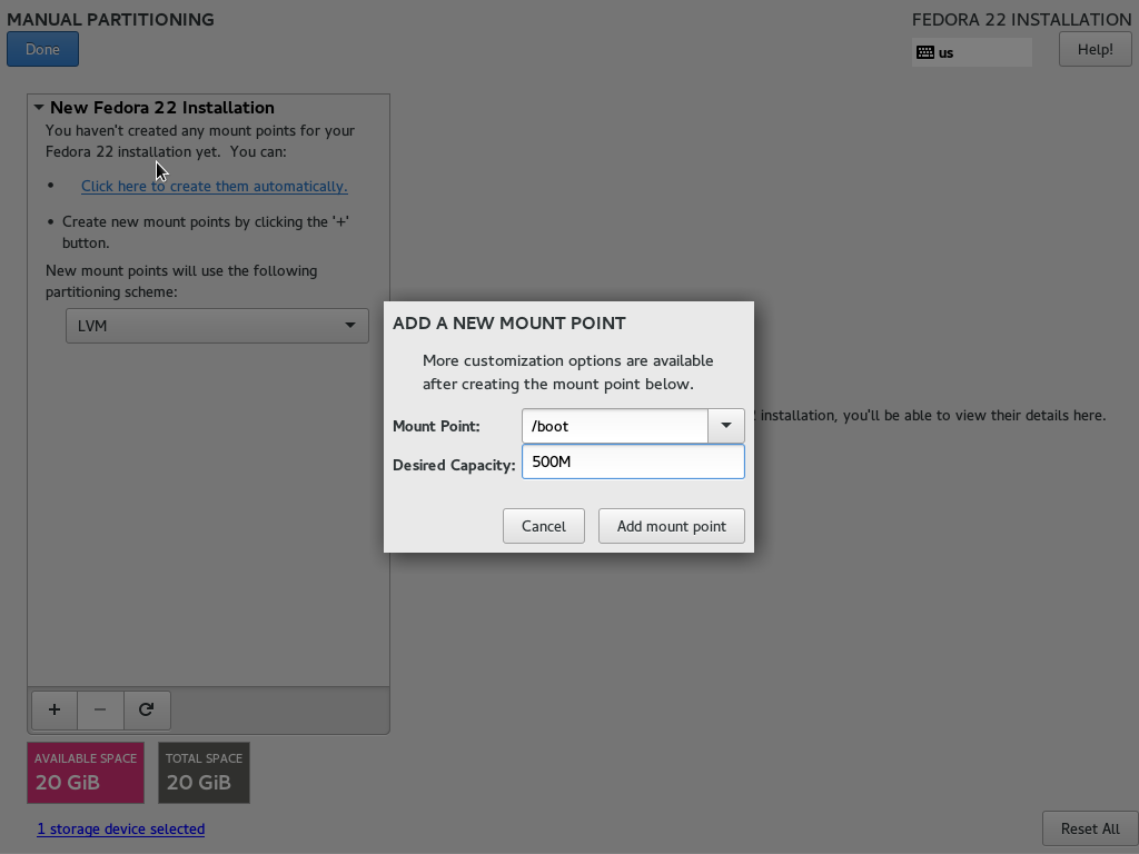 9. Use LVM partitioning Scheme, if you want to install and extend it to LVM. On most of the server, LVM is almost there. Click on + on the bottom left and create /boot partitioning. Enter Desired Capacity and Click ‘Add mount Point‘.