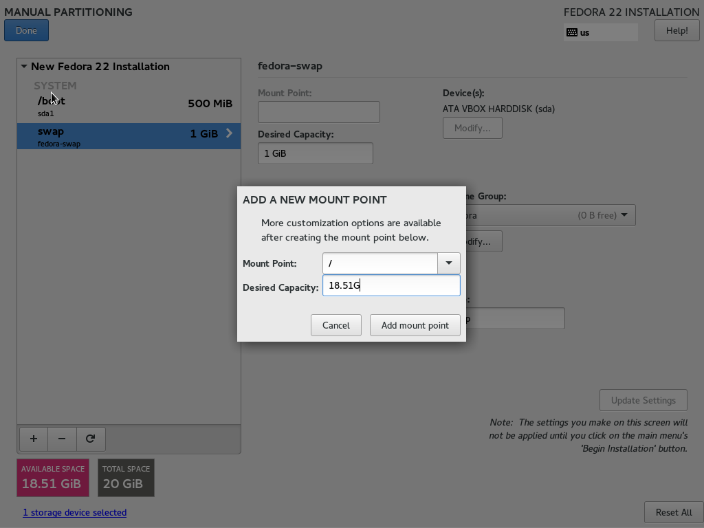11. Finally we will be creating root partition (/), add all the Remaining Disk Space and Click ‘Add mount Point‘.