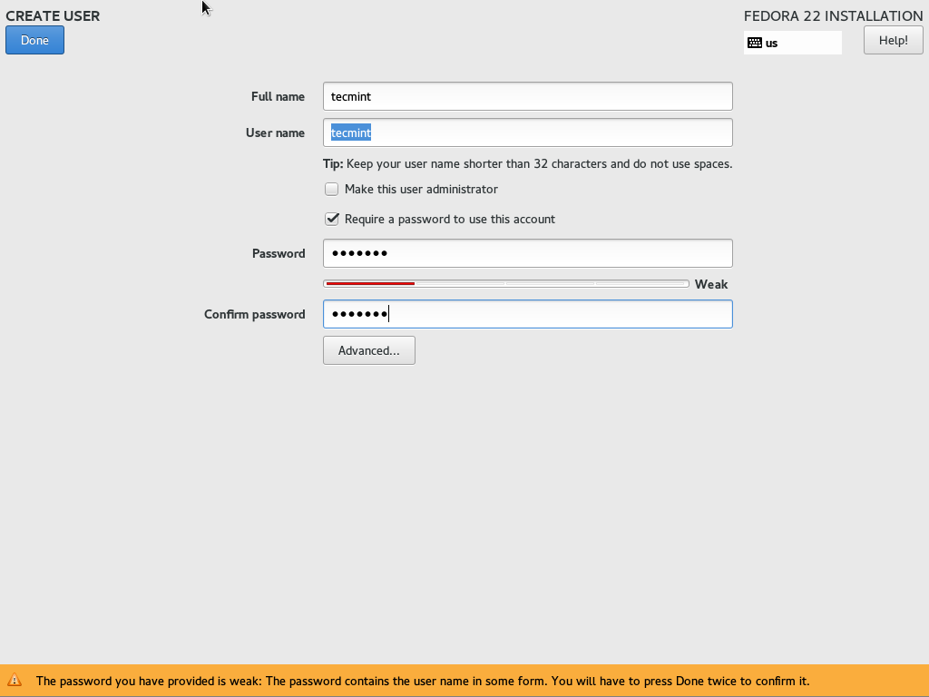 19. Next click on ‘User Creation‘ from the configuration Interface and fill up necessary information like full name, user name and password. You may like to see ‘Advanced options‘. Click Done, when you are done.