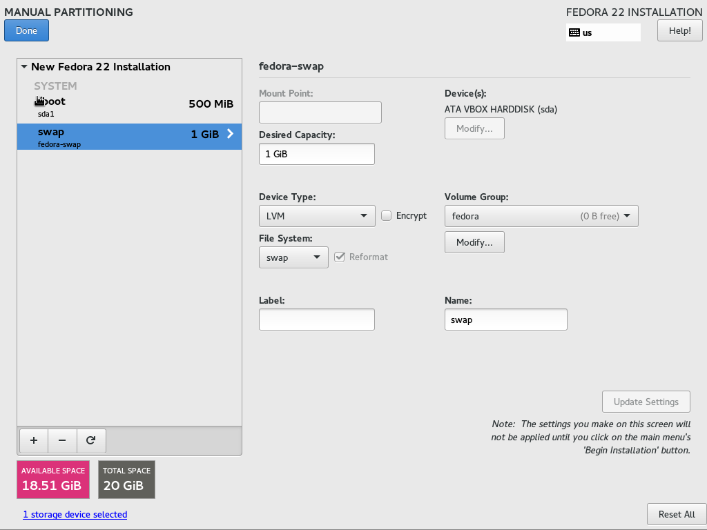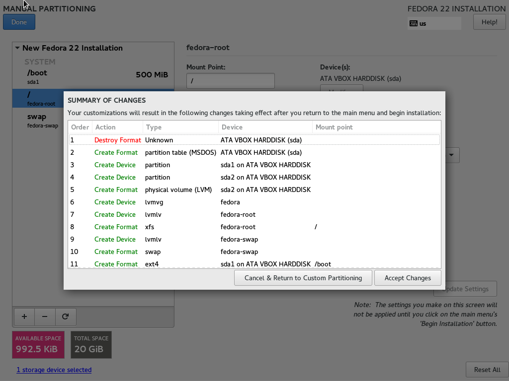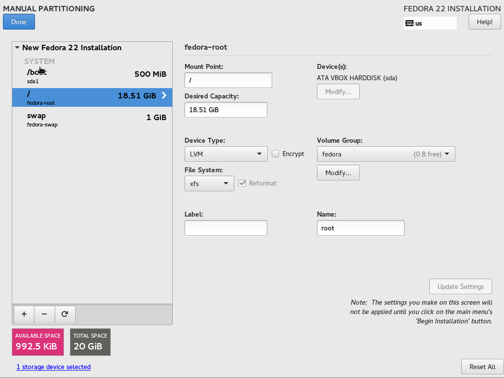 Note that File System Type for root is ‘XFS‘ and Device Type is ‘LVM‘. Click Done after cross checking every options.