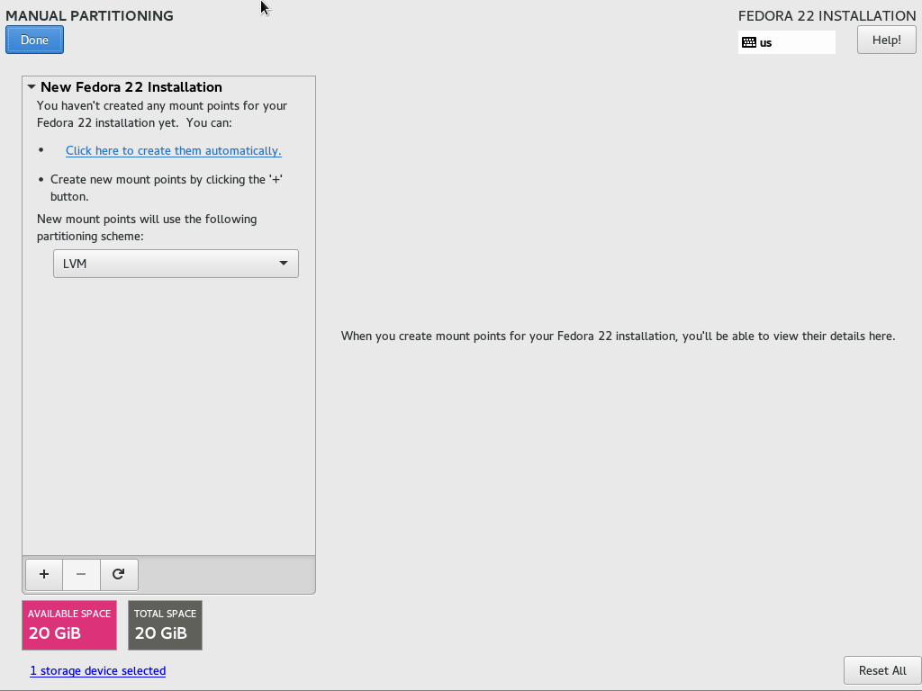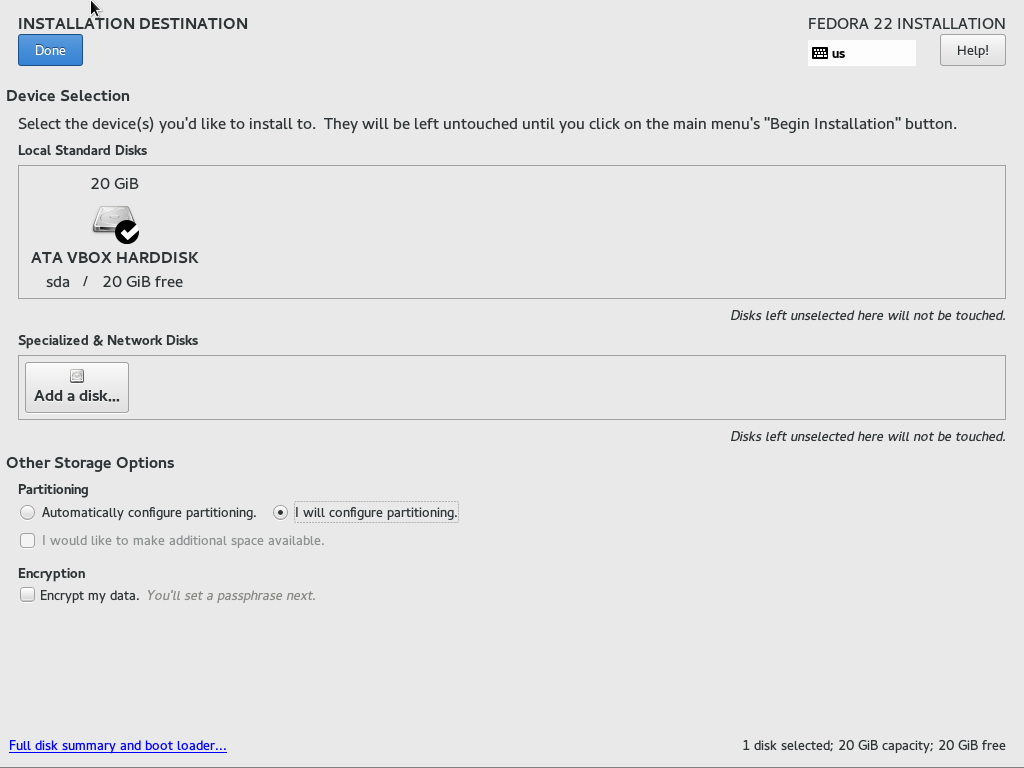 Note the default option is ‘Automatically Configure Partitioning‘ change it to ‘I will Configure Partitioning‘, to partition manually. By Selecting Manual Partitioning, you can make most out of your Space. Also you may select to ‘Encrypt‘ your data from this window. Finally click done.