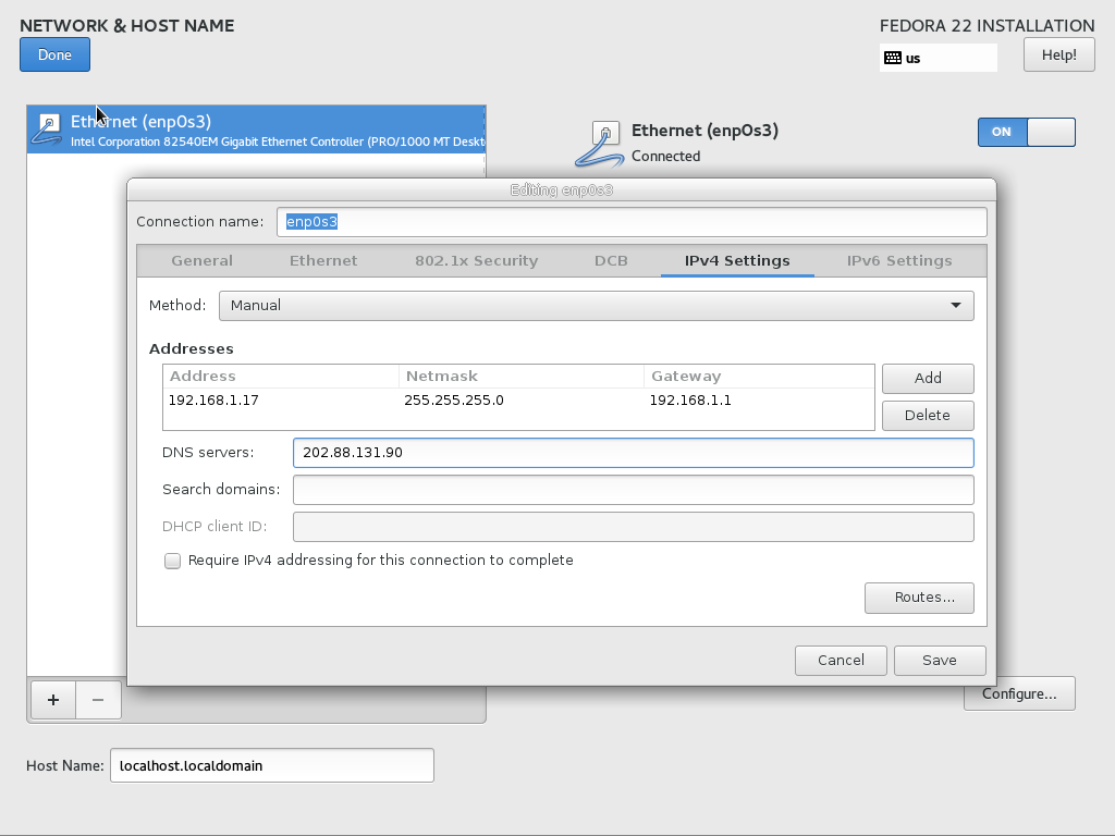 13. You will find yourself again on “Installation Summary” Interface. Click on Network and Host Name. You got an interface to modify your IP, DNS, Route, Subnet Mask and Host Name.