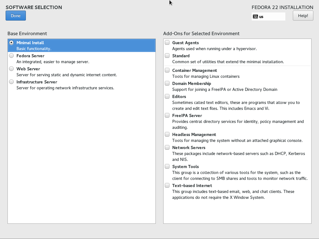 Here in this example I have selected ‘Minimal Install‘, as well. Select base environment and click Done!