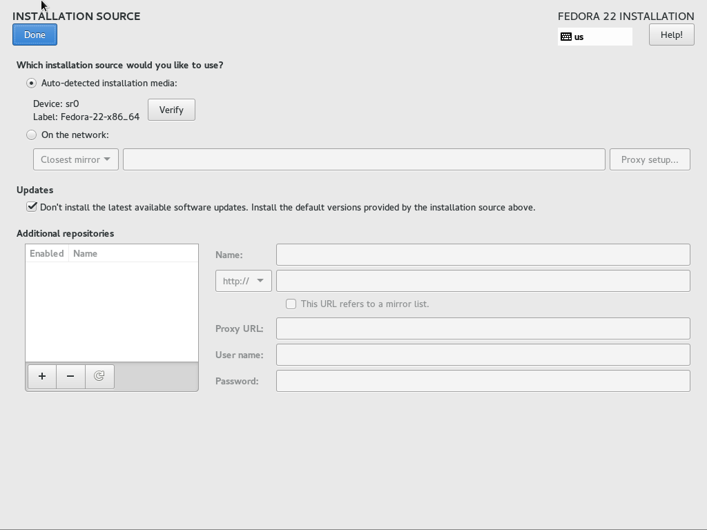 If you are not sure about what to do on this window, leave everything as it is. Note that ‘Auto-detected installation media‘ is enough to install Minimal Fedora Server. Click Done in either case.