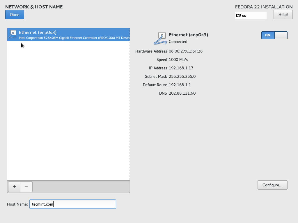 15. You will be back to ‘Network & Host Name‘ Interface. Here you may set Host Name and for the changes to be taken into effect immediately, switch off and again on Ethernet, from this interface. Finally click Done! When everything looks okay.