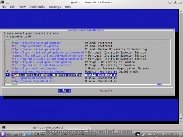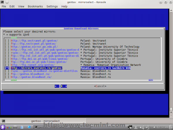 A tool called mirrorselect provides a user-friendly and intuitive text interface to help you quickly select your preferred mirror. To launch it, run the following command, which will append the selected mirror to the make.conf file.