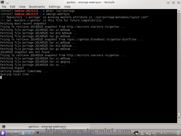 To do so, invoke the emerge-webrsync command as shown.