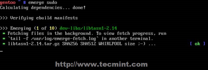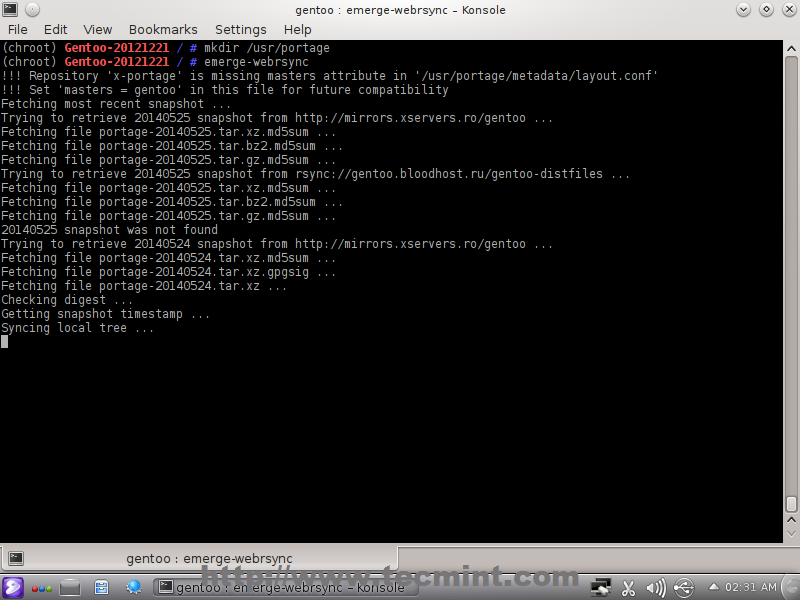 The command fetches the latest snapshot from one of Gentoo’s mirrors and installs it on your system. The snapshot is usually released on a daily basis from Gentoo. If there’s a need to update the repository, you can do so using the command: