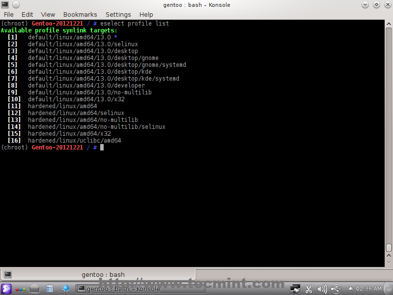 Once you’ve viewed the available profiles for the amd64 architecture, select the preferred option as shown. In our case, we will select the profile for the KDE systemd as shown.