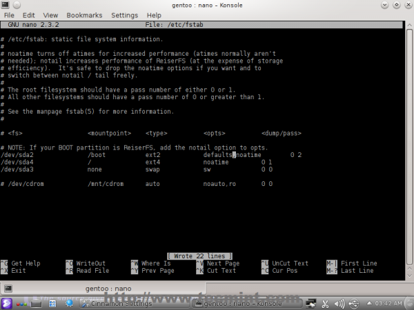With the kernel already in place, the remaining steps will involve configuring basic system settings. In this step, we will configure the /etc/fstab file to automatically mount the system partitions created in the first part of this installation guide.