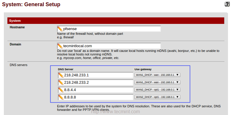 From “System” Menu choose “General Setup” and check for DNS respectively, which we have assigned under gateway.