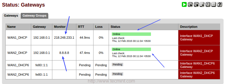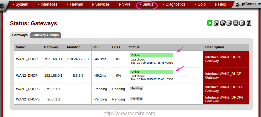 14. To verify the Load Balancer, go the ‘Status‘ from the top Menu and click on “Gateways” to verify that the both Gateways are online.