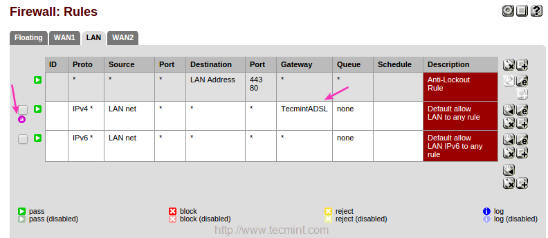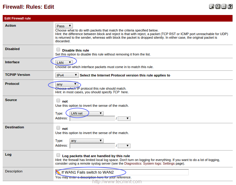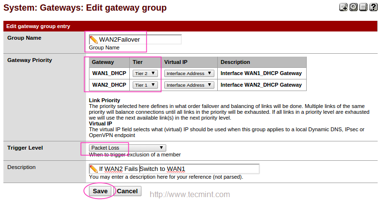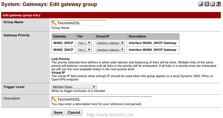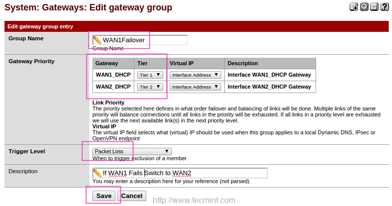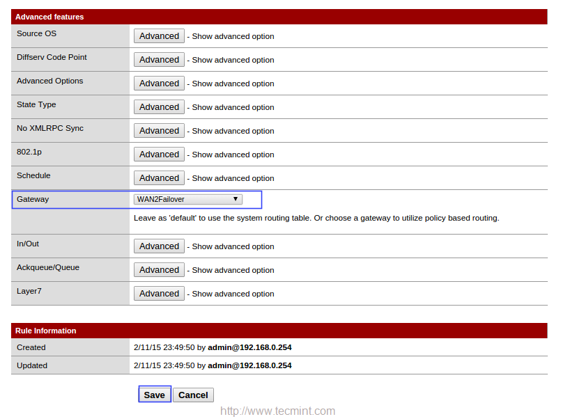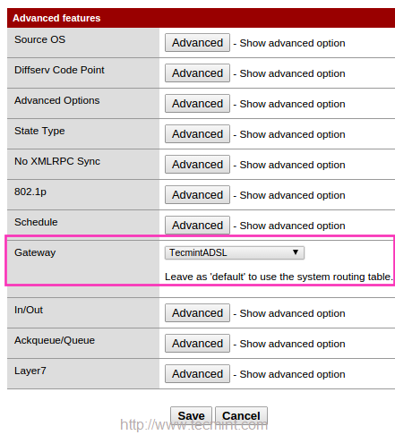 13. At the bottom of the page, choose the created Gateway Group “TecmintADSL” by clicking on Advanced under Gateway option and click on save to Apply changes to make the changes permanent.