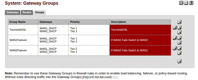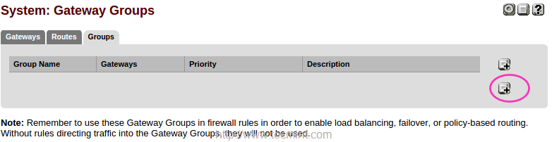 16. To setup a failover in Pfsense, we need to create different Tier, navigate to “System” menu and choose “Routing“. There we can see Gateways already assigned for LoadBalancer, so let’s create two groups for failover now.