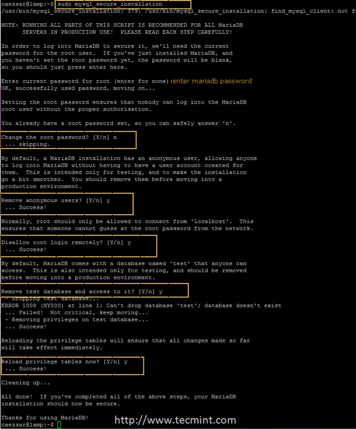 8. After MariaDB server finish installing, it’s time to proceed with a standard database secure installation, which will remove the anonymous user, delete test database and disallow remotely root logins.