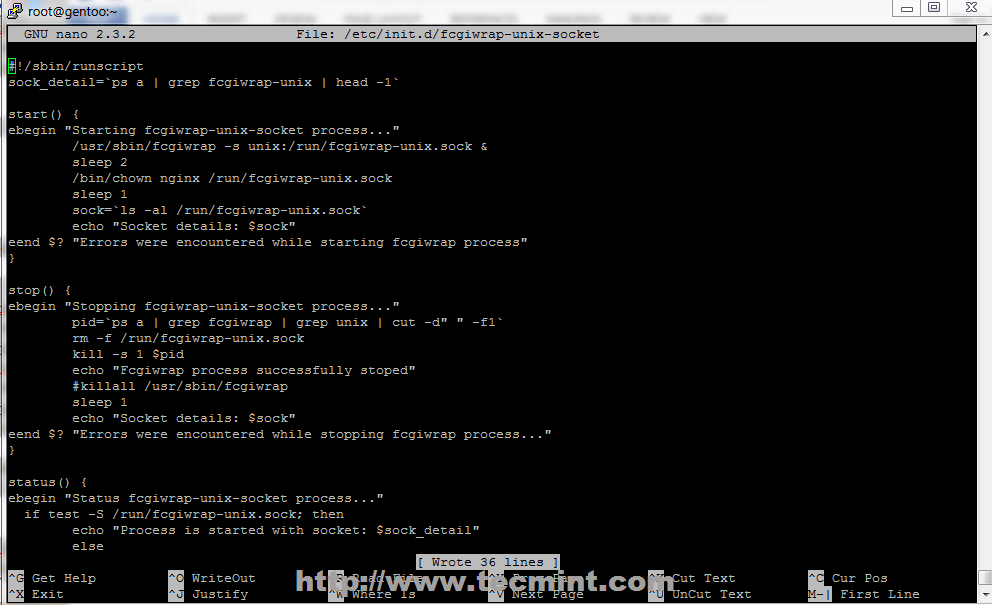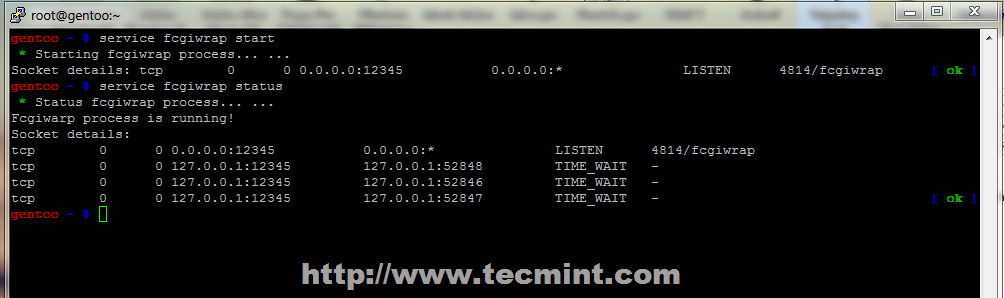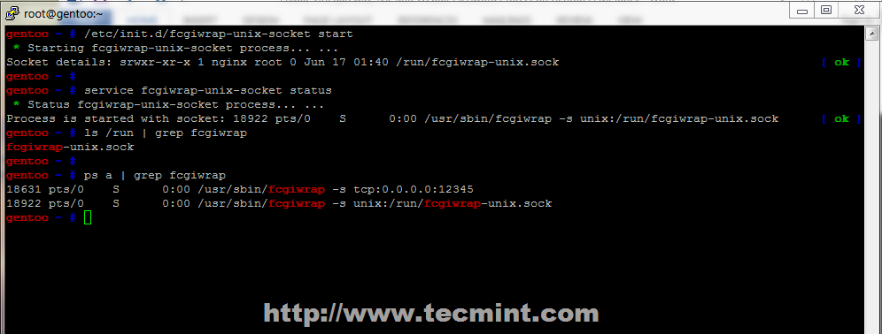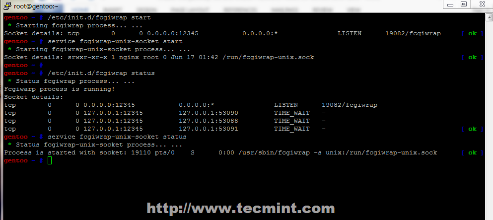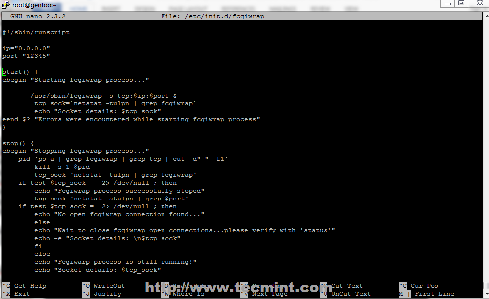 2. By default Fcgiwrap package doesn’t provide any init scripts on Gentoo to manage the process. After the packages has been compiled and installed create the following init scripts that helps you to manage Fcgiwrap process using three approach: either launching the process using Unix Domain Sockets or using local TCP Sockets or using both at the same time.