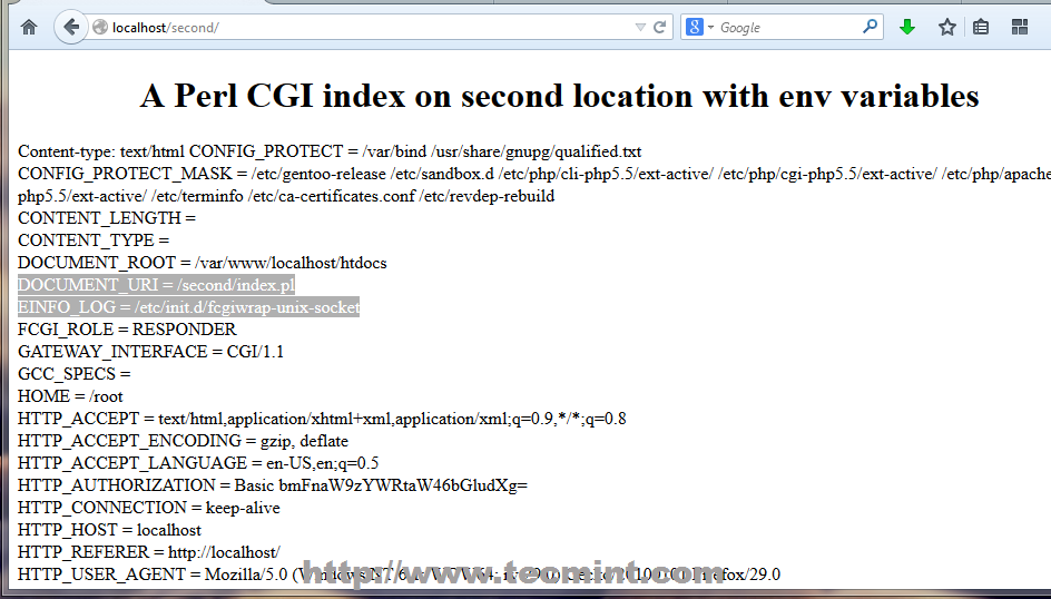 An example, is presented below (localhost), which activates Perl and CGI scripts on all files placed in root path (/var/www/localhost/htdocs/) with .pl and .cgi extension using Fcgiwrap TCP Sockets for default root document path, the second location using Unix Domain Sockets, with an index.pl file and the third location is using TCP sockets with an index.cgi file.