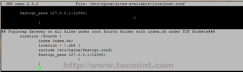 10. After the package has been compiled and installed, move to Nginx sites-available and edit localhost.conf file by appending the following statements before last curly bracket “ } ”, which activates support to run Ruby scripts on a fourth location under default document root path served by Nginx localhost.