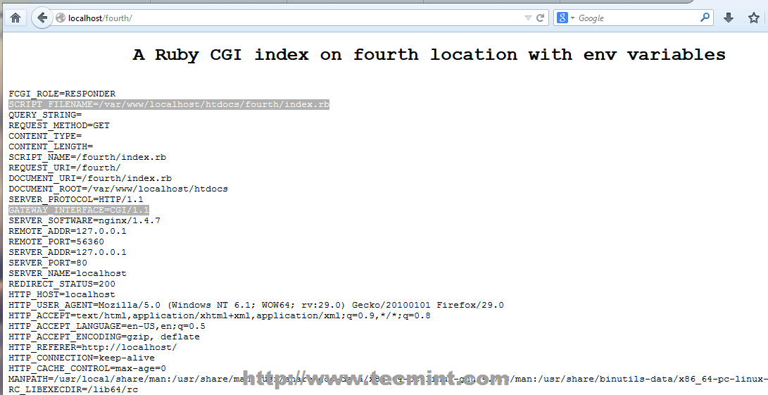 That’s it for now, you have configured Nginx to serve dynamic Perl, Ruby and Bash scripts on FastCGI Gateway, but, be aware that running this kind of interpreted scripts on Nginx CGI Gateway can be dangerous and impose seriously security risks on you server because they run using active shells under you system, but can expand static barrier imposed by static HTML, adding dynamic functionality to your website.
