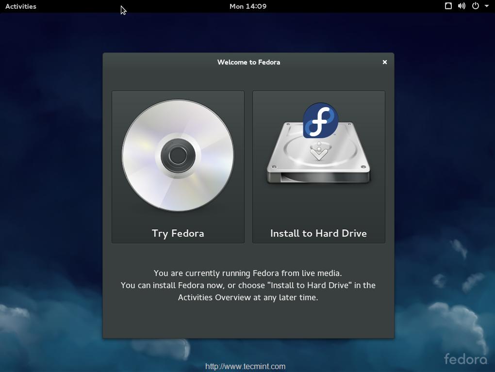 2. After booting, you will get the option ‘Try Fedora‘ to explore Fedora 21 before installing on the hard drive, or else you can choose ‘Install to Hard Drive‘ option to install Fedora 21 on the machine.