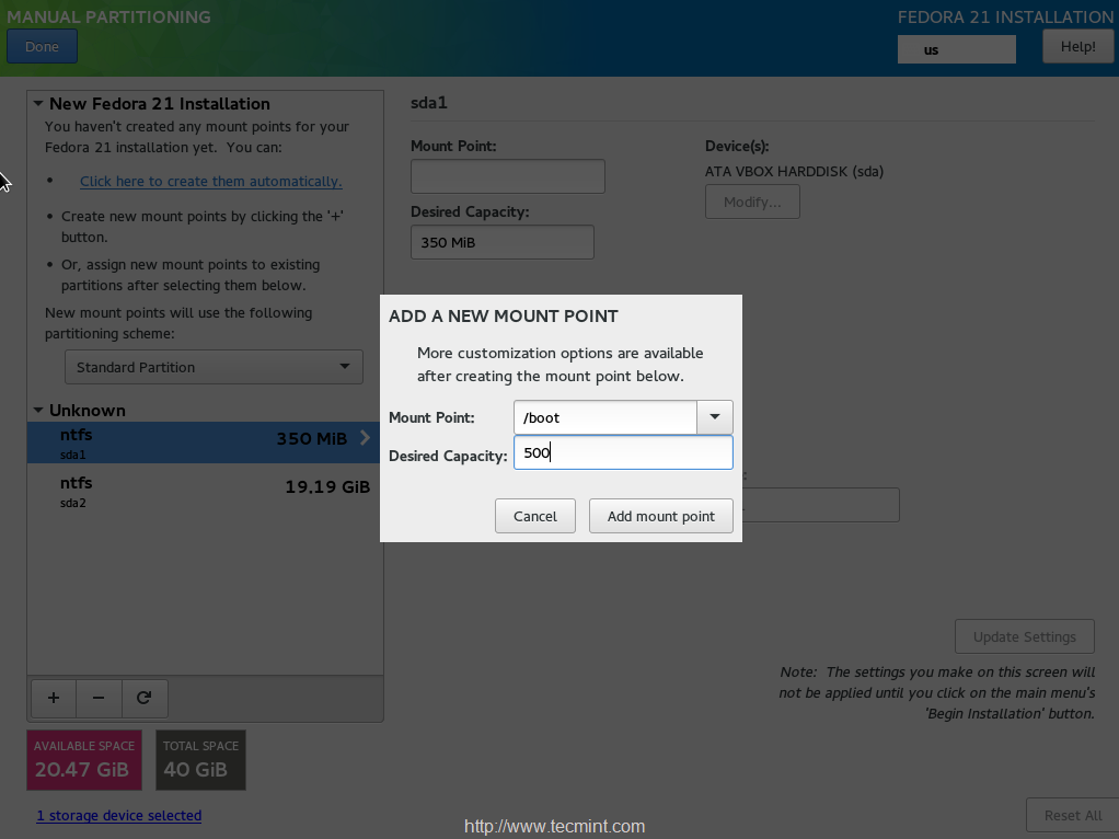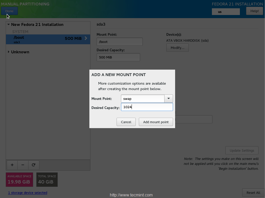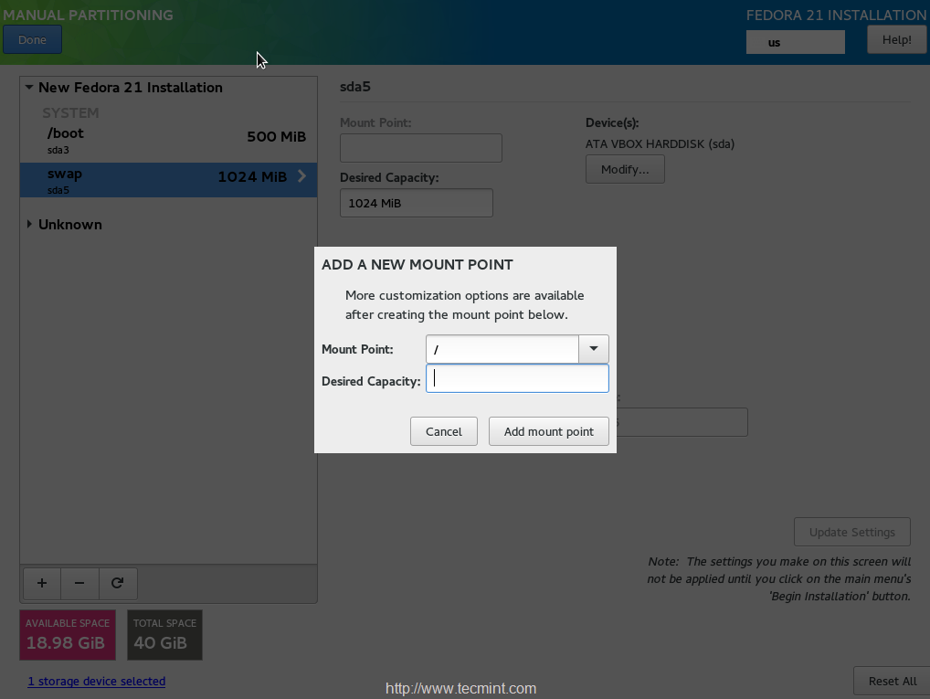 8. Select the “Available Space” and click on ‘+‘ sign to create /boot, / and swap mount points for fedora installation.