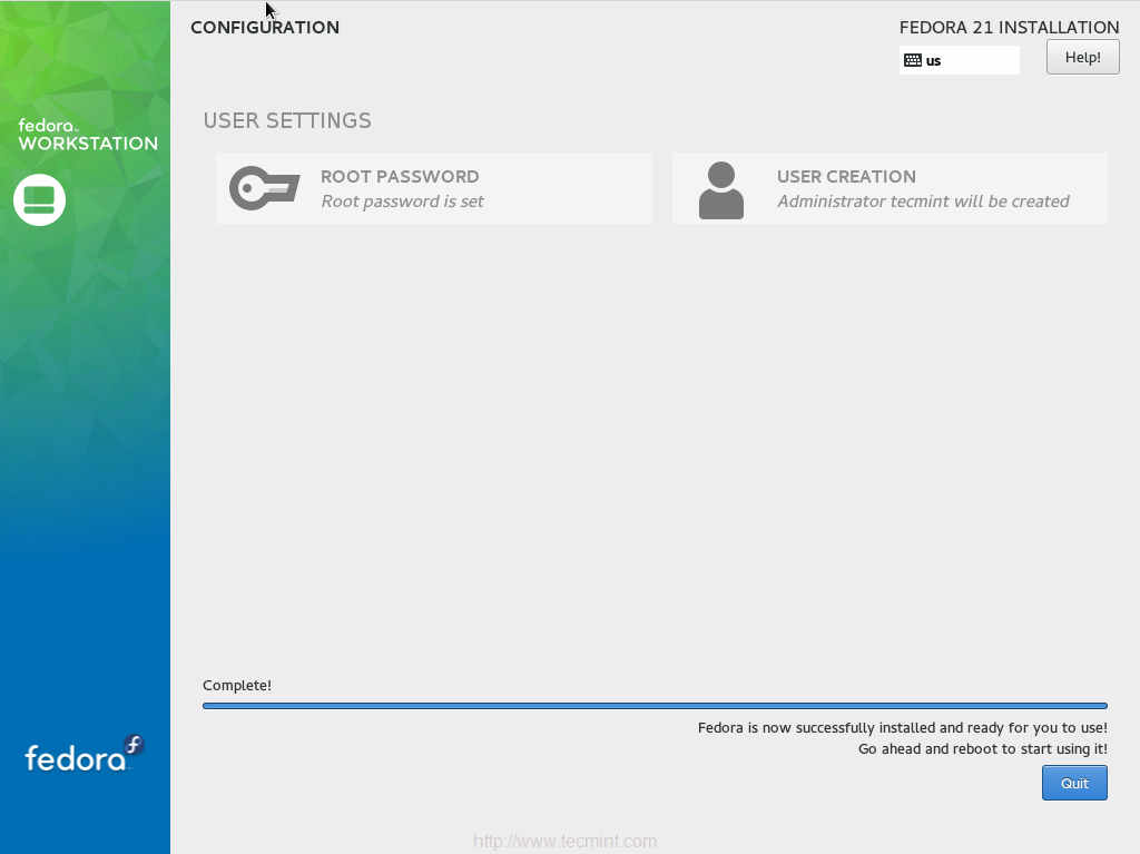 11. Click on Quit to reboot the machine after the Installation completes, at bottom you can see that Fedora is now Successfully installed and ready to use.