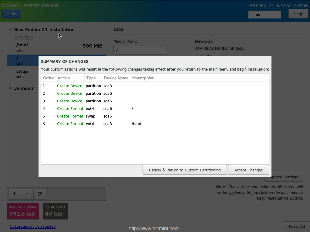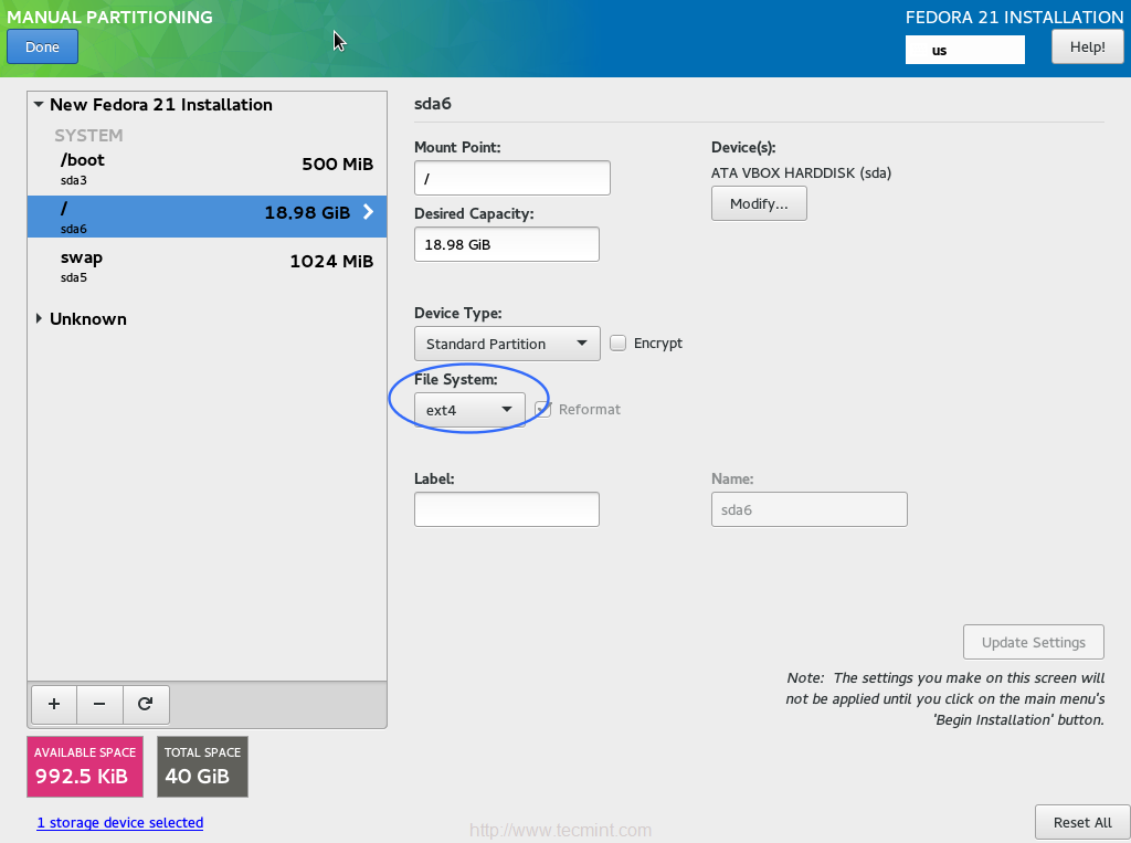 After creating all above three partitions, choose the file-system type as “ext4” for the Fedora installation.